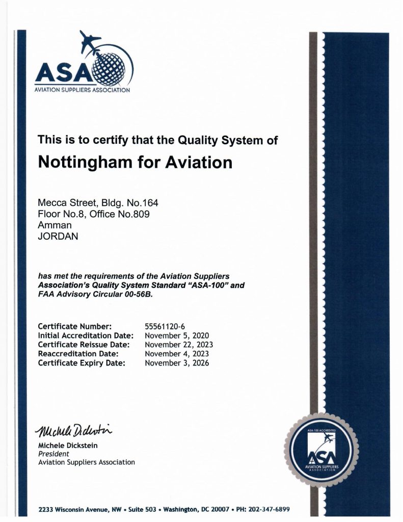This certificate explains that Nottingham Aviation has met the requirements of the Aviation Suppliers Association’s Quality System Standard “ASA-100” and FAA Advisory Circular 00-56B.